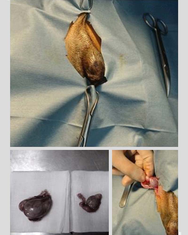 隱睪症 首頁 病例分享 隱睪症 先天異常隱睪症 隱睪症是犬貓很常見的先天異常。 殘存在體內的蛋蛋會因為溫度較高的關係,發生腫瘤的機率是正常蛋蛋的10倍以上; 且在狗狗中老年後一樣會造成賀爾蒙相關的問題(如會陰疝氣、攝護腺腫大等)。 因此一但發現隱睪建議都要積極處理,也不可以貪小便宜只結紮正常位置的蛋蛋喔。 照片是單側腹腔隱睪的狗狗, 藉由腹中線旁切創進入腹腔取出隱睪, 和正常位置的蛋蛋相比可發現因萎縮的關係體積明顯較小。