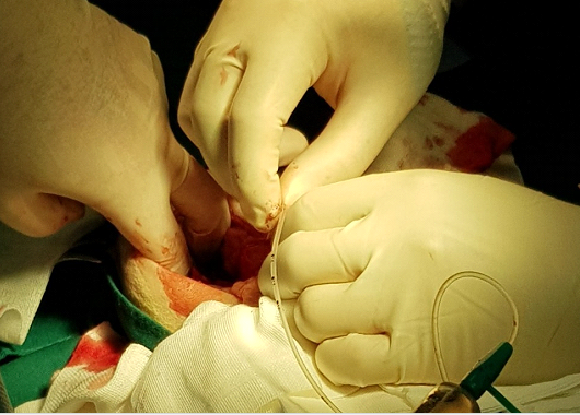 貓咪灰灰最近食慾下降,原本以為是牙齒不舒服打算來醫院安排洗牙,卻在術前檢查發現灰灰的皮膚有黃疸,仔細詢問主人發現這幾天有斷斷續續嘔吐的狀況。血檢下肝膽指數及黃疸指數過高,隨即安排腹部超音波檢查,發現灰灰的膽囊內有一顆石頭,堵住膽囊的出口造成膽管阻塞跟膽汁逆流,跟飼主討論後決定嘗試裝設暫時性膽管支架。