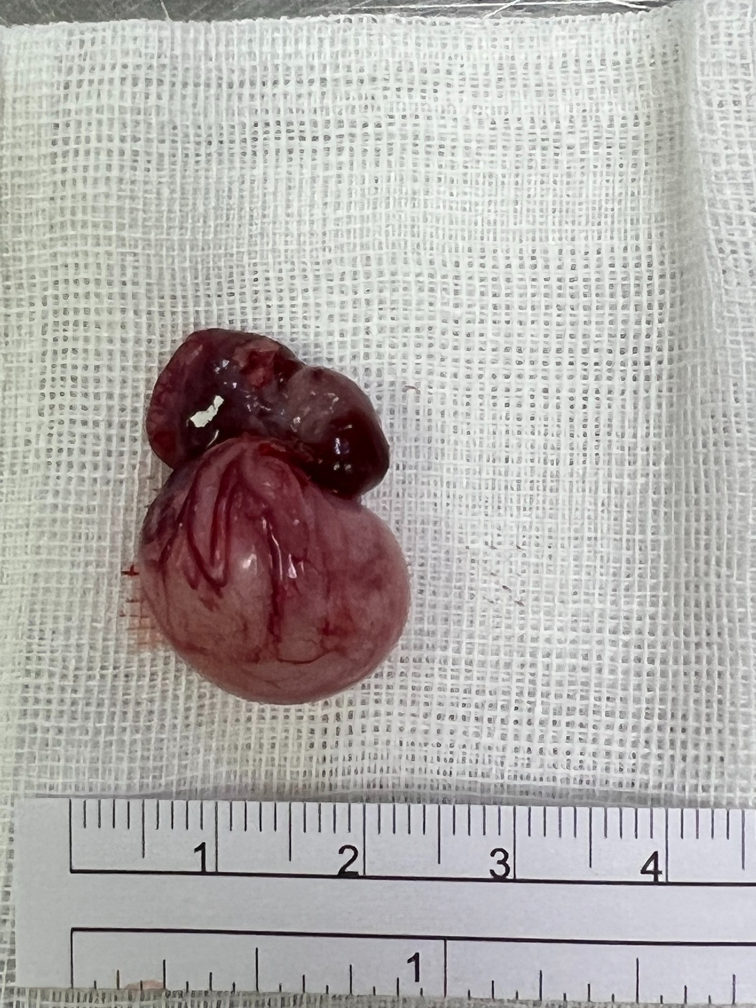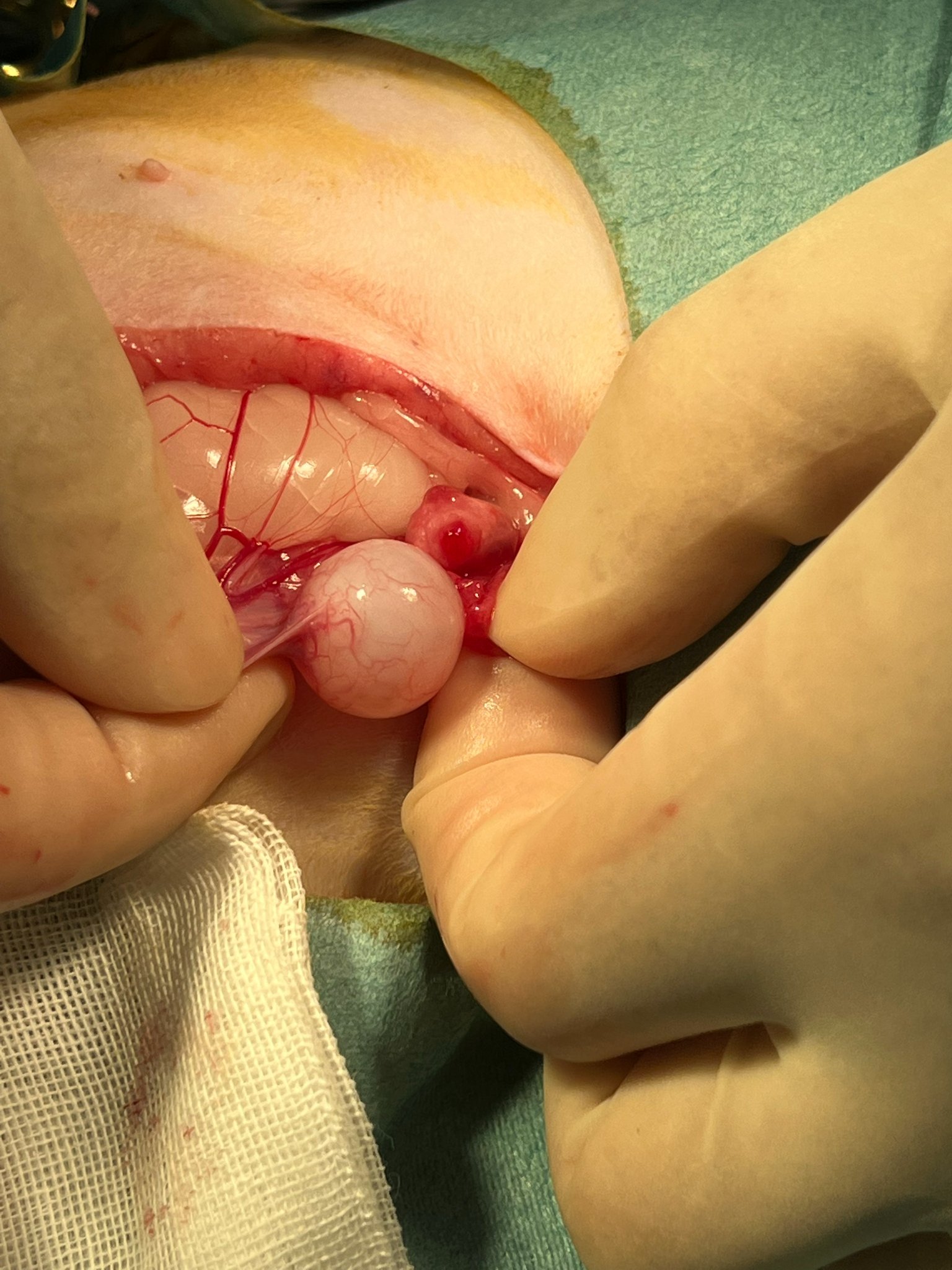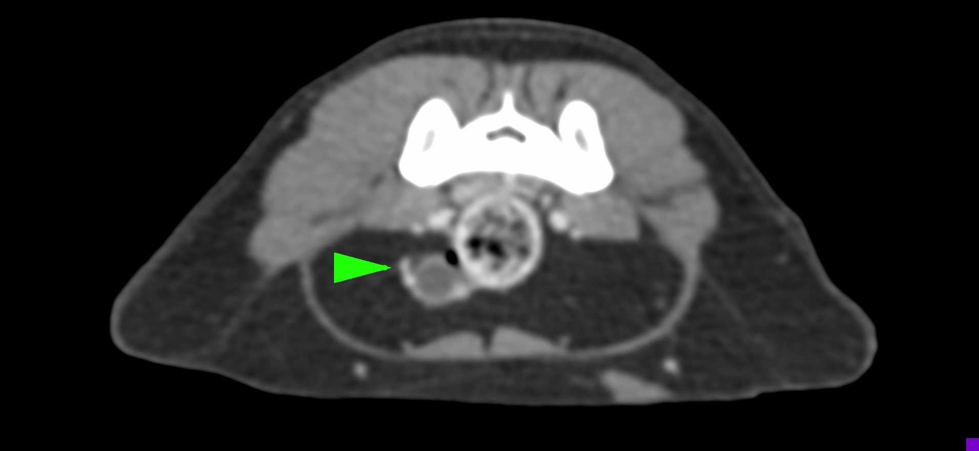 小花是一隻一歲多的母貓,半年前曾在其他醫院做過絕育手術,但手術當下卻只找到單側的子宮卵巢,且在這半年當中仍然反反覆覆地發情,讓飼主十分擔心,於是來到築心尋求治療。在了解小花的狀況後,我們為小花安排了電腦斷層掃描,並在腹腔的左側發現了疑似殘存的卵巢影像(見圖示),接著,在影像定位的協助下順利開腹取出殘存的卵巢和發育異常子宮角,而在殘存的子宮內已然形成了子宮蓄膿。