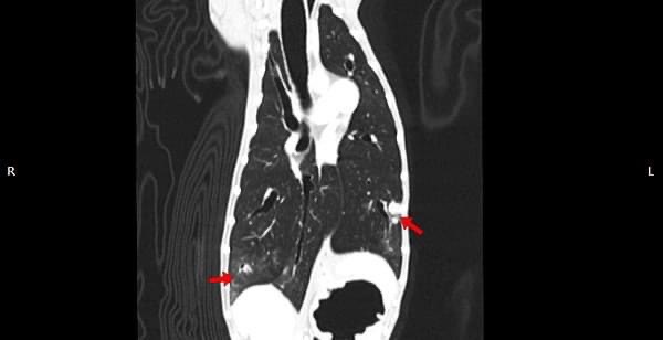 狗狗的慢性鼻炎維持3-4個月,越來越嚴重,他院轉診至築心,經由內視鏡+電腦斷層確認為鼻腔上皮癌,而且由於病程時間長,已經轉移至胸腔,代表壽命不長了,至少家人心中有個答案,有心理準備陪狗狗最後一段路。