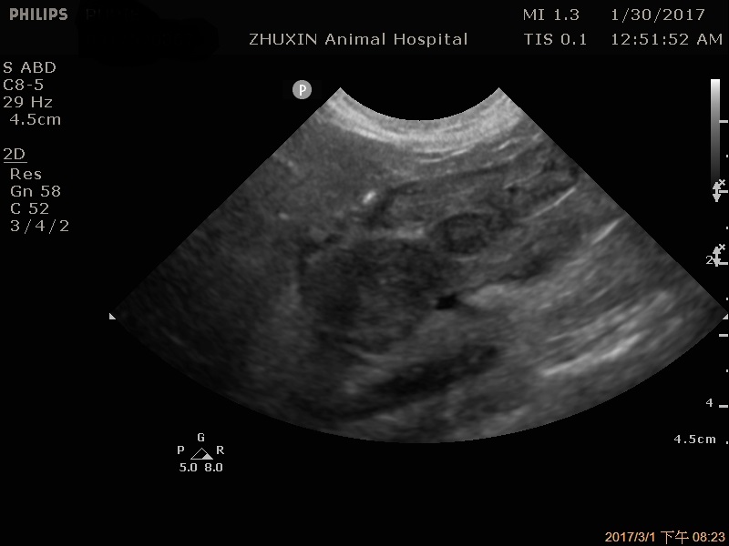 慢性消瘦、嘔吐的老貓,在他院反覆檢查一直找不出病因,經由超音波掃描終於發現問題,胃部有多發性團塊,強烈懷疑淋巴瘤,因貓咪已經非常虛弱,最後決定安寧治療。