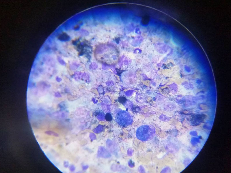 病理切片診斷為惡性周邊神經鞘膜瘤,圖為細針採樣的腫瘤細胞。