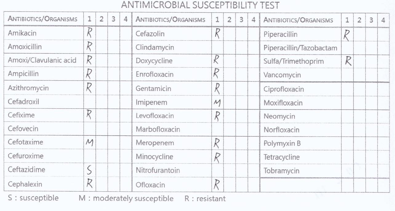 染色下細胞抹片可見發炎細胞跟桿菌,細菌培養結果為綠膿桿菌,對一般抗生素無效。