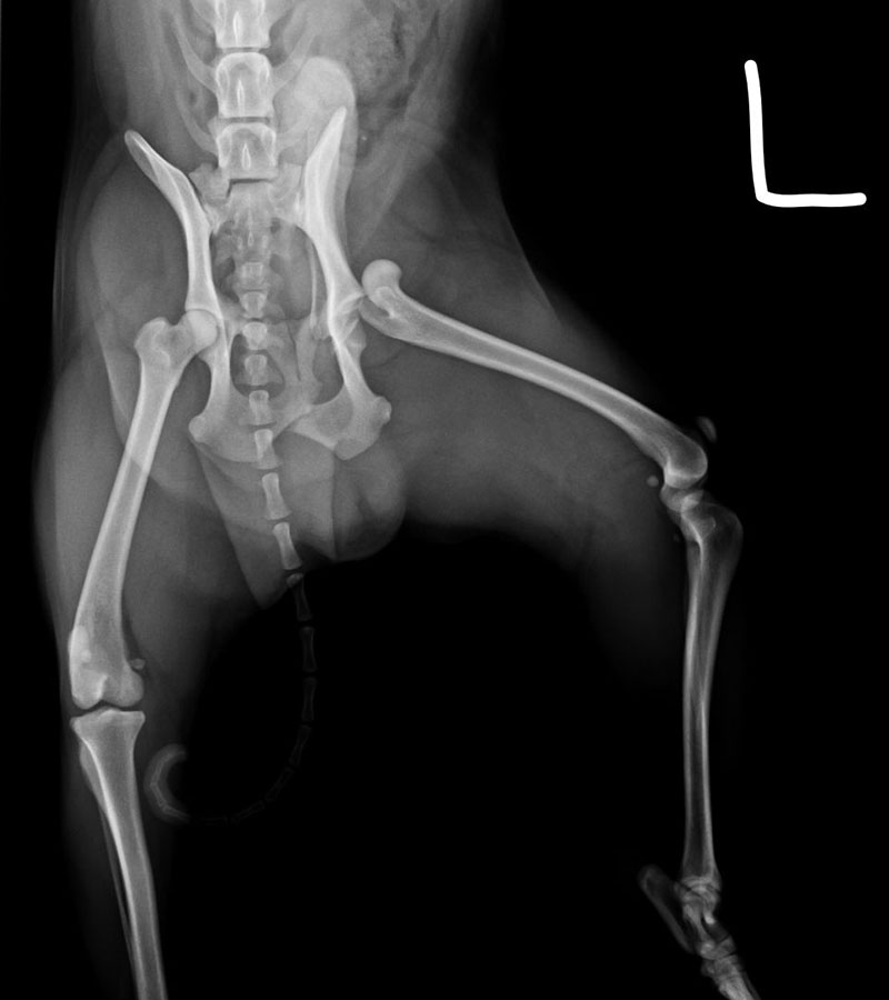 車禍導致左後肢疼痛不敢踩地的柴弟經過X光確診為股骨頭脫位,跟飼主討論不同的治療方式後最後決定採用股骨頭切除術,目前已解除疼痛並回復正常行走。