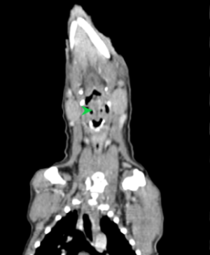 病理報告為嚴重、慢性活躍性、漿細胞及化膿性喉炎,伴隨肉芽組織生成及局部上皮細胞異型性,會厭旁團塊