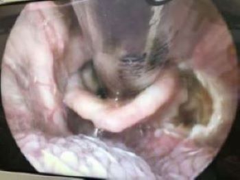 利用內視鏡輔助套環套住團塊後經電燒將可見到範圍盡量切除乾淨。