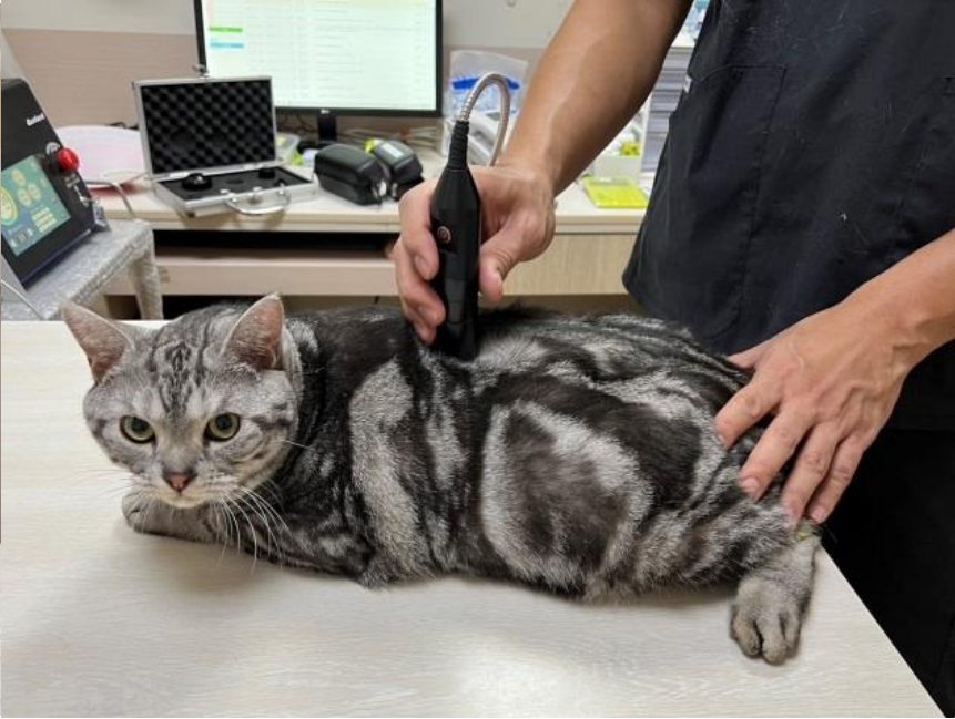 針灸針要能夠長時間停留在貓咪身上,對醫師及飼主來說皆是一大挑戰,第一次嘗試針灸的 Miru,很快就受不了而將身上的針都甩掉,所幸本院引進四級雷射機,針對無法忍受針灸的汪喵們,能有另一安全且有效之選擇。