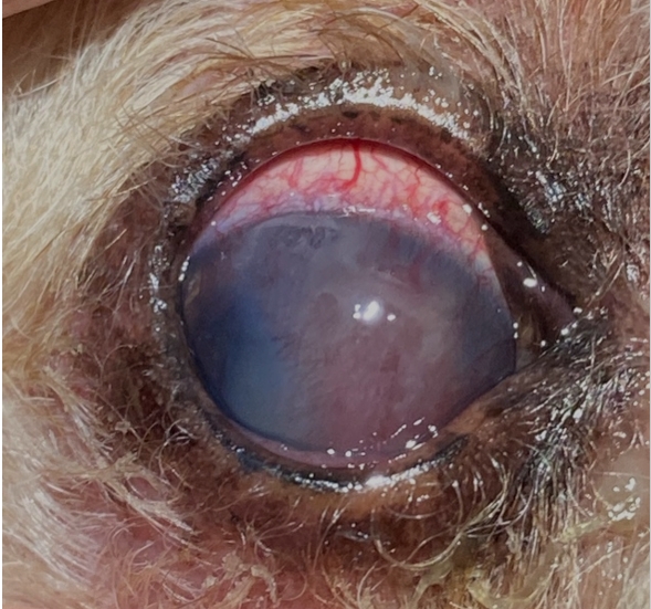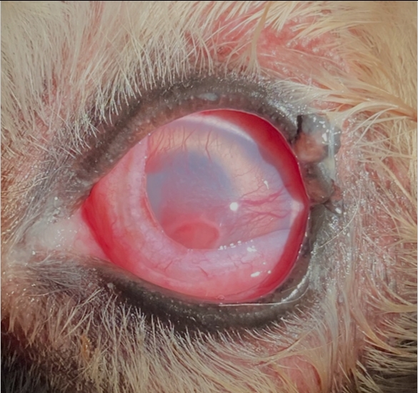 圖一、慢性角膜潰瘍患犬的角膜表面佈滿血絲。