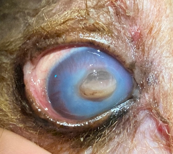 圖三、角膜穿孔的眼睛,中央為角膜基質和纖維素等物質從穿孔處脫出。