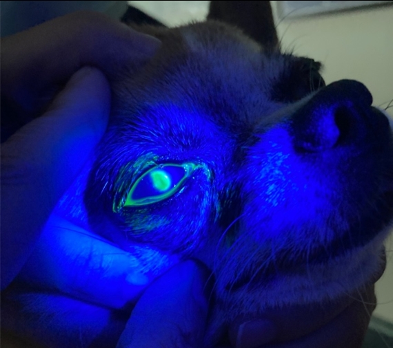 圖四、螢光染色可用於診斷角膜潰瘍,以及判斷角膜潰瘍的深度。