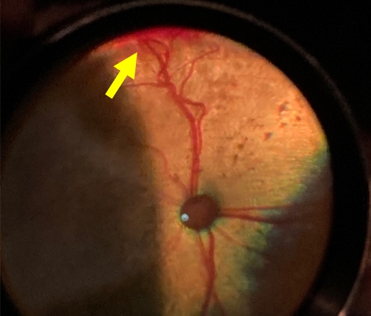 圖一、因為慢性腎病而具有高血壓的患貓,出現急性視網膜剝離。於瞳孔內可見到視網膜被推擠至水晶體後方,且多處血管有出血的病灶。當時這隻貓咪呈現短暫失明,而在後續用藥控制血壓後恢復部分視力。