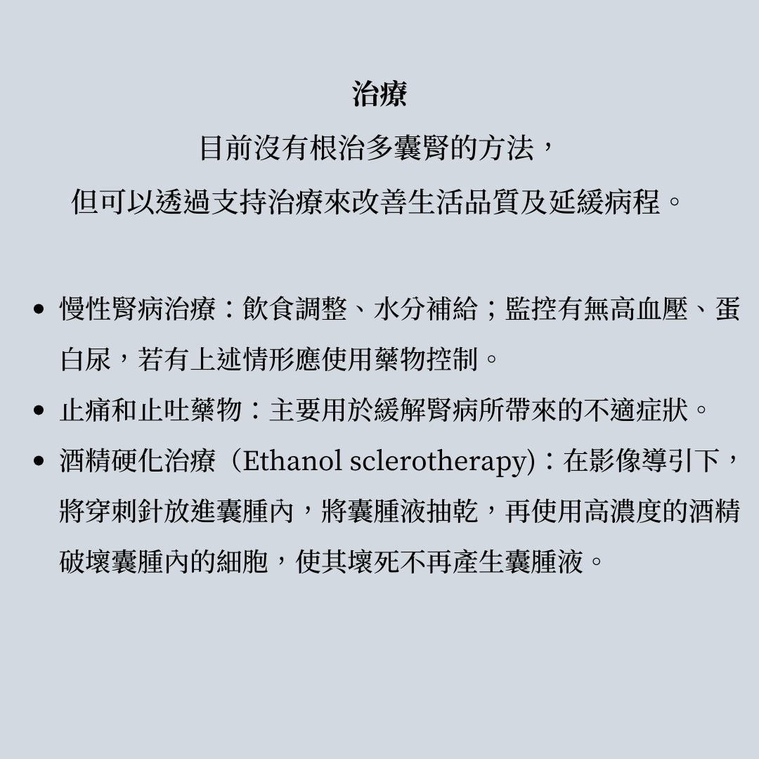 目前沒有根治多囊腎的方法,但可以透過支持治療來改善生活品質及延緩病程: