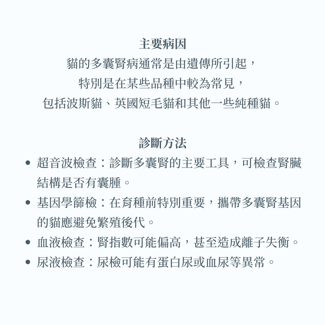 - 遺傳因素:貓的多囊腎病通常是由遺傳引起的,特別是在某些品種中較為常見。最常見的品種包括波斯貓、英國短毛貓和其他一些純種貓。