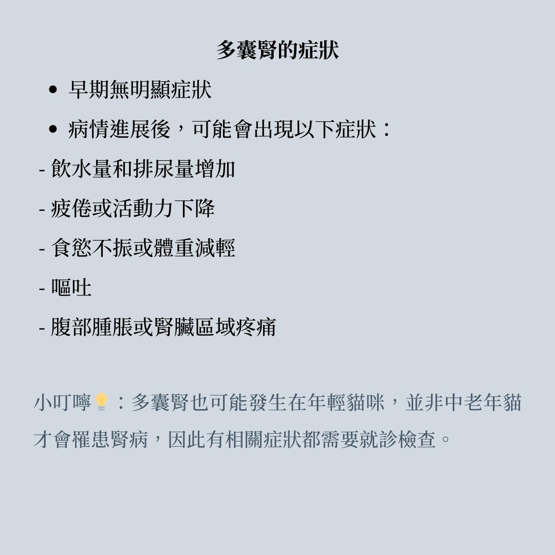 小叮嚀:多囊腎也可能發生在年輕的貓咪,並非中老年貓才會罹患腎病,因此有相關症狀都需要就診檢查。
