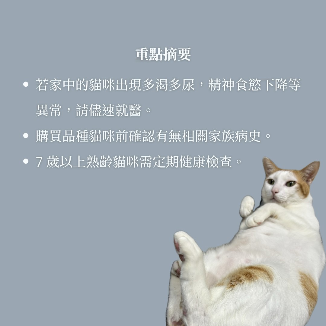 若家中的貓咪出現飲水量或排尿量異常增加,活動力下降、食慾減退等異常,請儘速就醫。