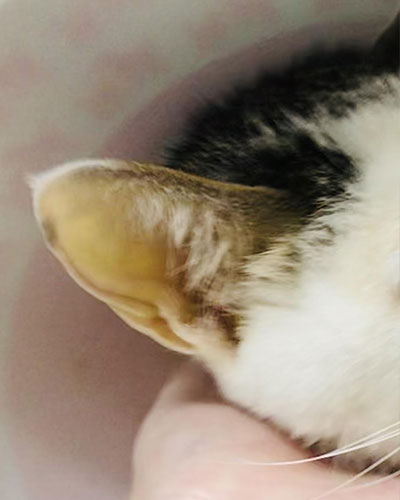 門診檢查時,獸醫師發現阿魯的精神很差、背上的皮拉不太起來,口水也乾乾的,仔細一看,還發現阿魯的耳殼、眼白、嘴巴黏膜跟肚皮的顏色都是黃色的!