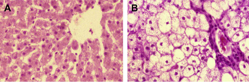 B 食慾下降三週貓咪的肝臟切片圖,可以看到肝臟細胞內充滿白色空泡,被許多脂肪堆積