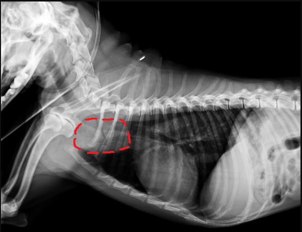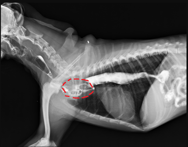 使用造影劑輔助確認下,確認異常影像位於食道,推測是大口吞入的肉塊,造成食道異物阻塞(圖二)