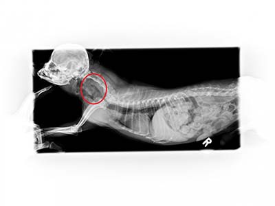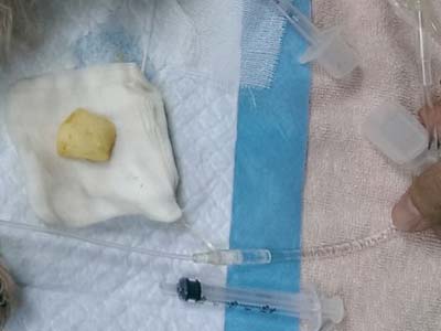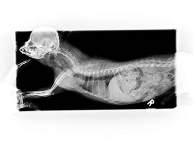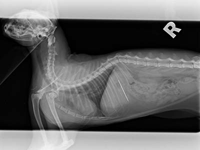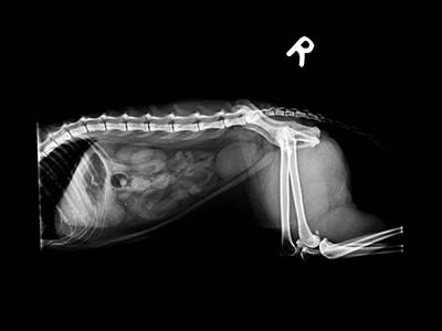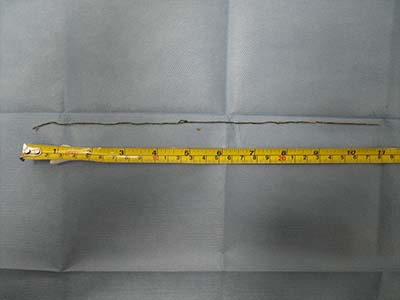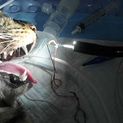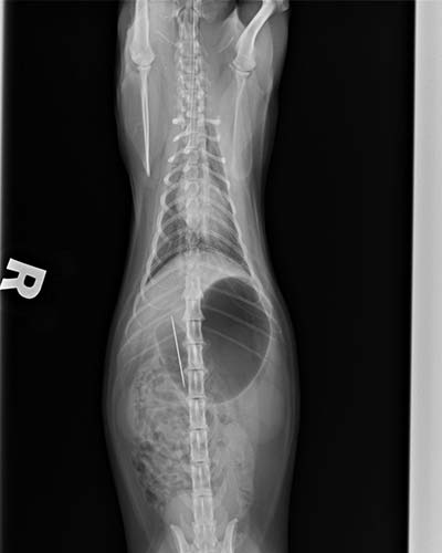 本病歷的小貓咪就是趁媽媽不在偷跑去玩線,媽媽回來後發現小貓一直乾嘔而帶來醫院就診,在X光下赫然發現胃裡有一根針!和醫師討論後手術利弊後,決定使用可以馬上回家且無創的內視鏡手術將異物取出。麻醉甦醒後,小貓很快恢復了精神活力,好像什麼都沒發生過,開開心心的回家了。