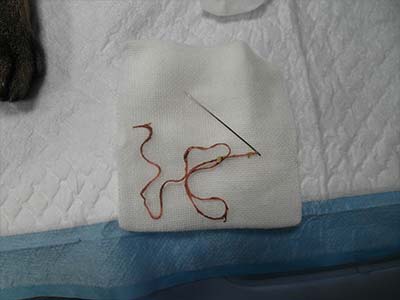 貓咪天性喜歡咬或是抓線狀的東西,且貓咪舌頭上有倒鉤,咬了線後常常就吐不出來,只好一直吞一直吞,最後連線最尾端連著的針也一起吞到肚子裡面了!