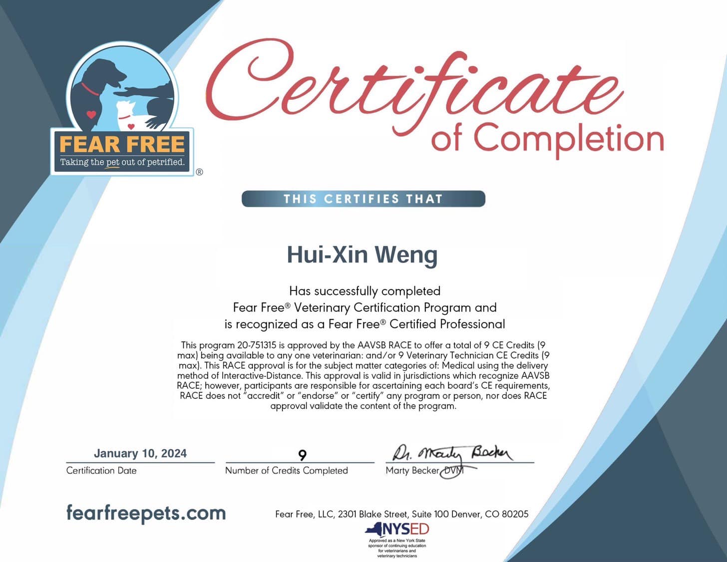 翁慧馨為築心門診醫師,完成Fear Free國際零恐懼醫療的教育訓練,取得FEAR FREE專業認證!