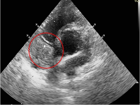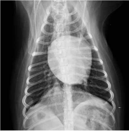 胸腔x光評估胸腔有無團塊,心臟大小;如果有心包囊積液,心臟會呈現圓且大的型態 (球形)。心臟超音波下評估心臟功能,心臟內外有無團塊樣組織,有無心包囊積液。