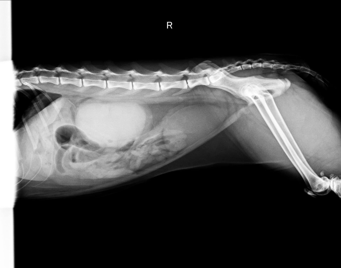 就診時發現牠嚴重脫水且腎指數高,檢查發現X光下明顯小腸擴張,大於正常的兩倍
