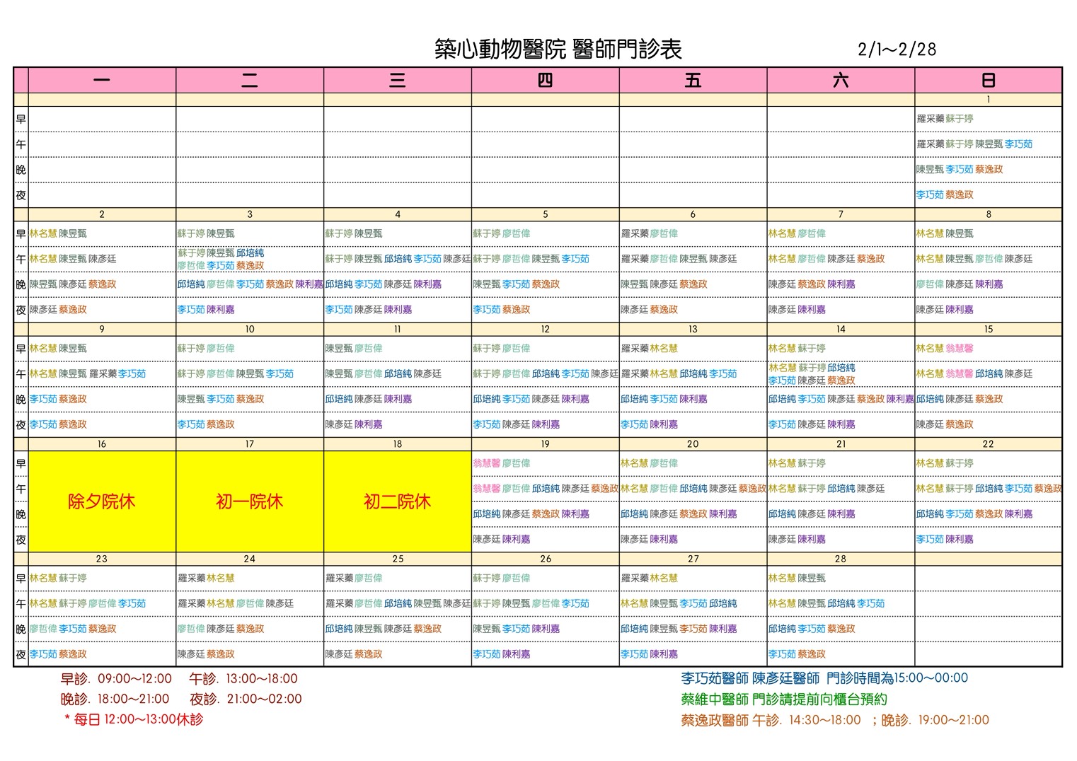 2026年2月醫師班表