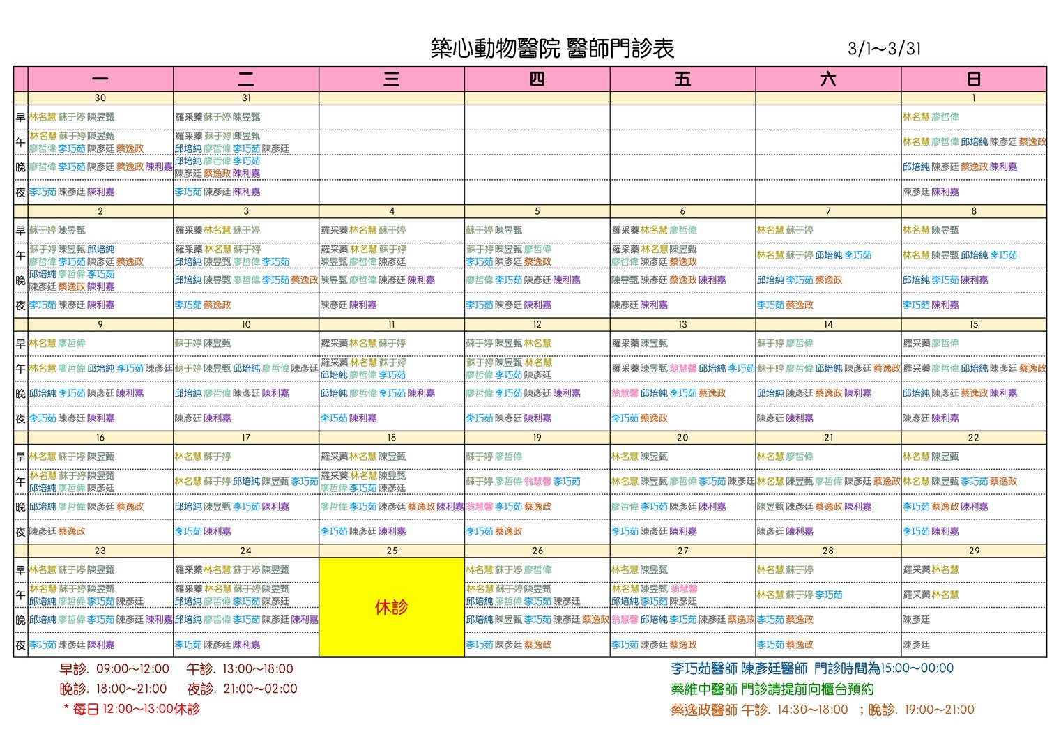 2026年3月醫師班表
